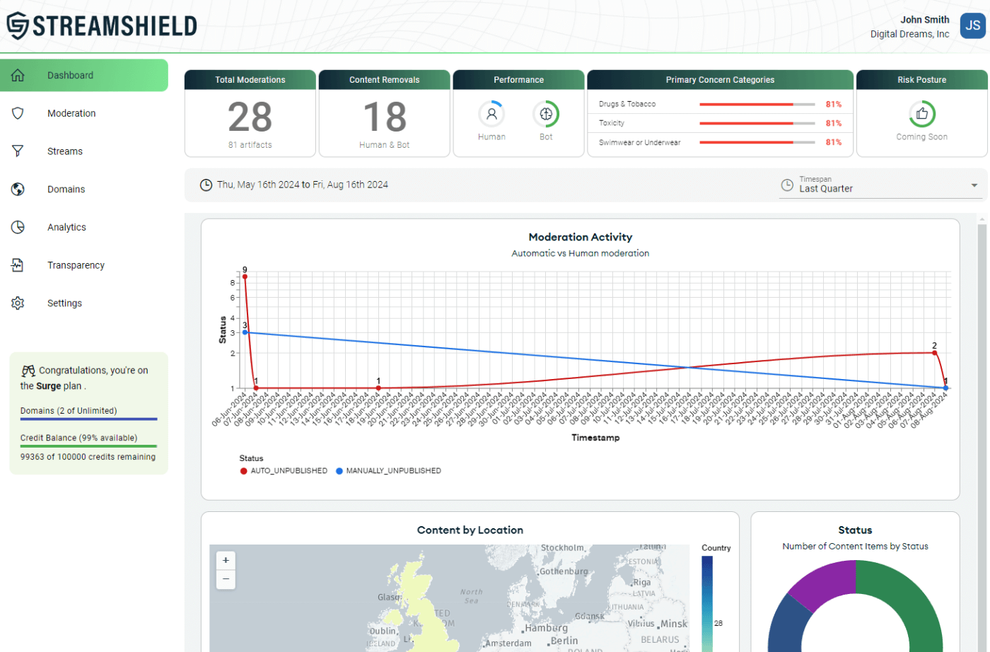 With Streamshield, the complexities of content moderation become streamlined and efficient, safeguarding digital platforms from harmful or inappropriate content. It’s the ultimate tool to maintain a secure and compliant online environment while enhancing user experiences and trust in your digital ecosystem.